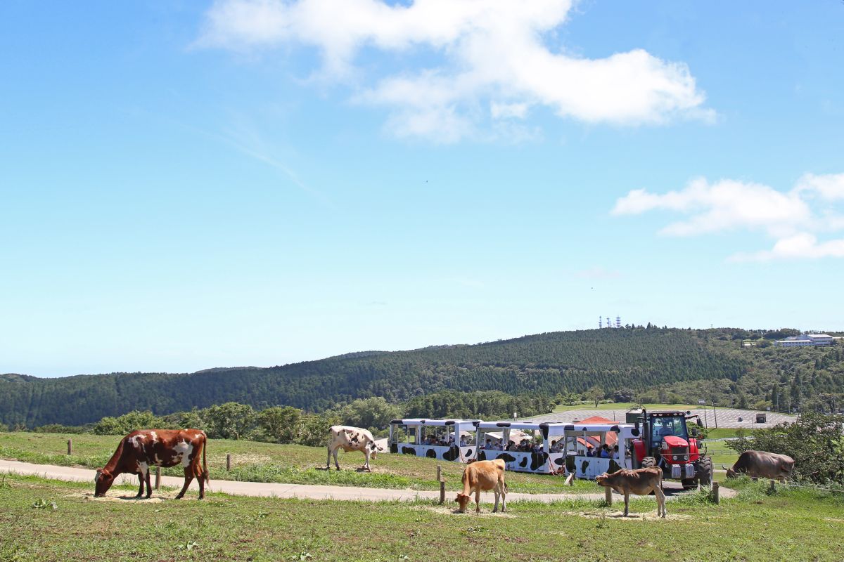 出発したらすぐにつづら折りの道を登っていきます。途中、いろいろな種類の牛たちがのんびりと草を食んでいる姿を見ることができます。日本では珍しい牛に、すぐ近くで出会えることも。しっかりと撮影しておきましょう。