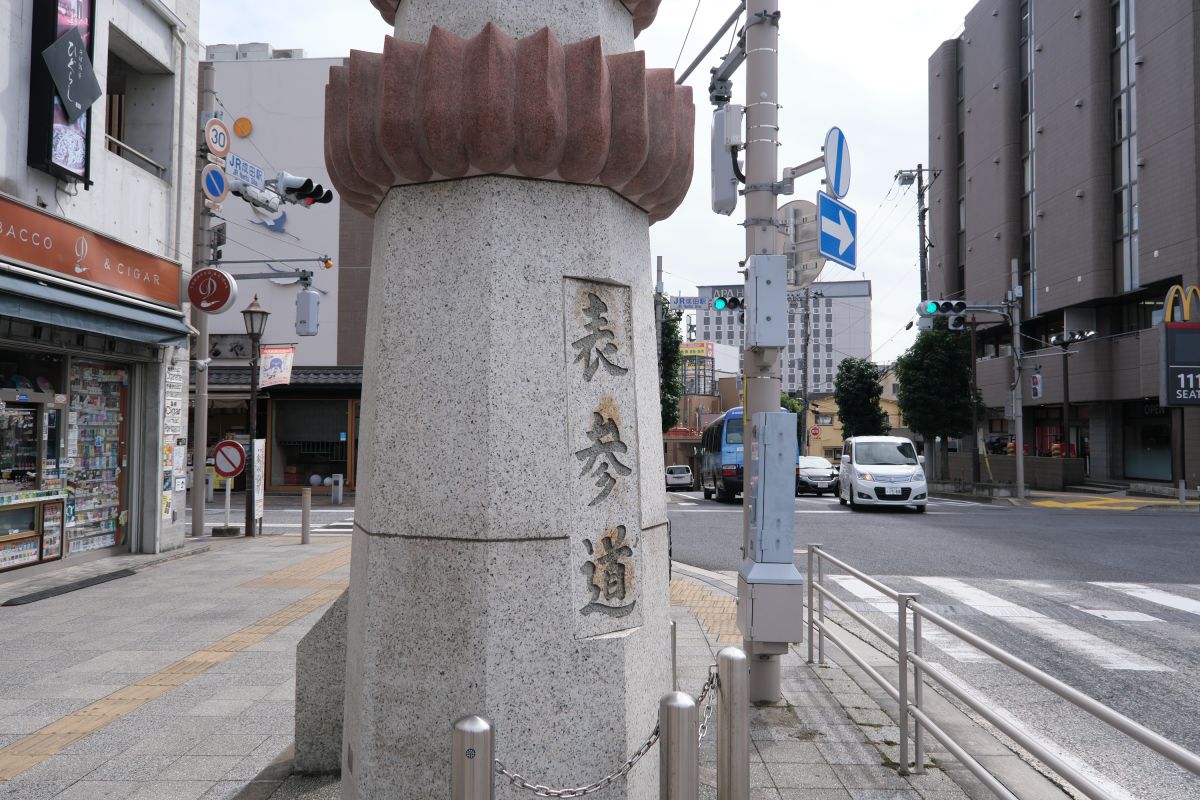 表参道と書かれたモニュメント。JR成田駅からはこの交差点を左に曲がります。ちなみに、この界隈は花崎町とよばれるエリア。外国人旅行者にも人気のレストランが集まっていて国際色も豊かです。