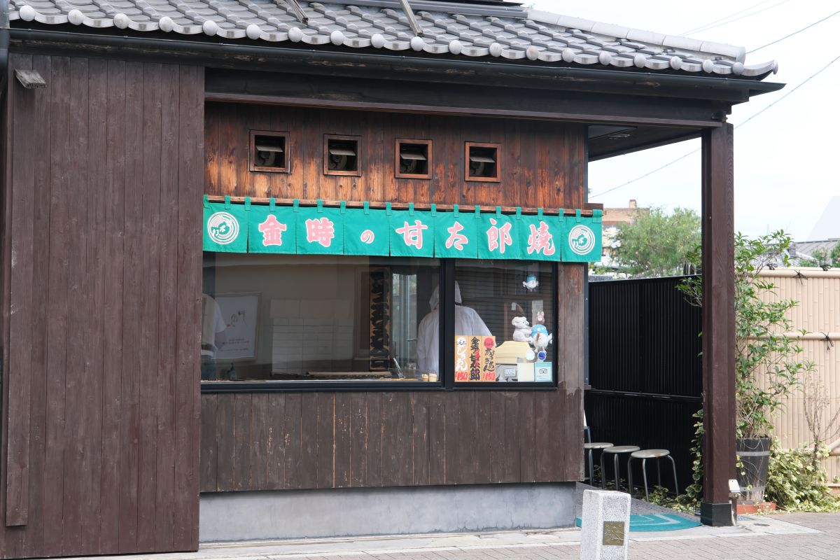 食べ歩きの一軒目はこちら、「金時の甘太郎焼」です。店頭では職人さんが丁寧に甘太郎焼を焼く姿が見られます。メニューは小豆餡と白餡の2種類のみ。どちらも薄皮のカリっとした生地に、豆の食感が残る餡がぎっしりと詰まっています。