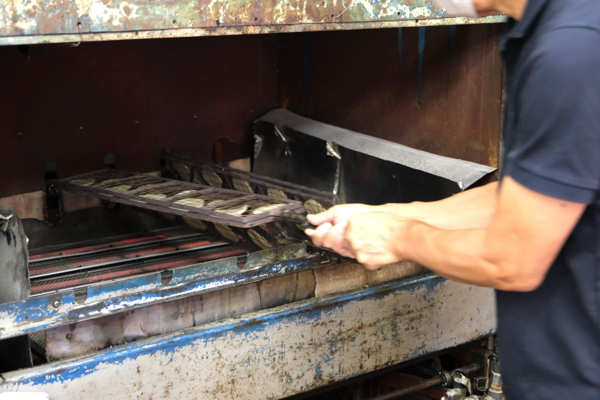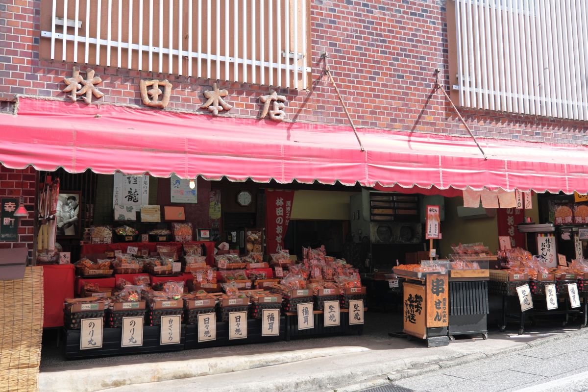手焼きせんべいで人気なのが「林田のおせんべい」。袋入りのせんべいのほか、食べ歩き用にぴったりの「串せん」を販売しています。店内では、年季の入った機械でせんべいを焼く様子が見られます。