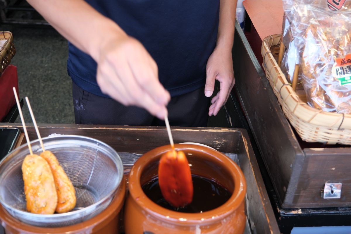 焼きたてのせんべいを串に刺して、自慢のタレにさっとくぐらせると串せんのできあがり。