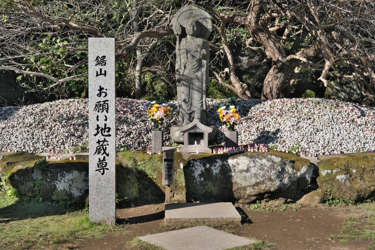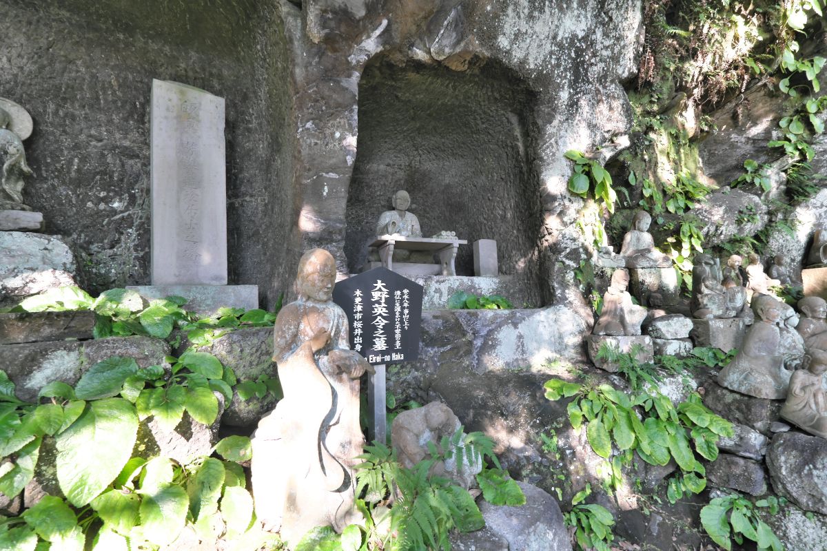 こちらは、この羅漢像群を彫った大野甚五郎英令の墓。甚五郎は現在の木更津市である上総桜井の石工で、門弟27人と21年がかりで彫ったのだそう。石材は鋸山のものではなく、伊豆から運んできたと伝わっています。