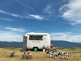 姫鶴平の絶景に現れたキュートなカフェスタンド。青空の下で味わうカルスト高原の牛乳を使った「カフェオレ」600円は格別!