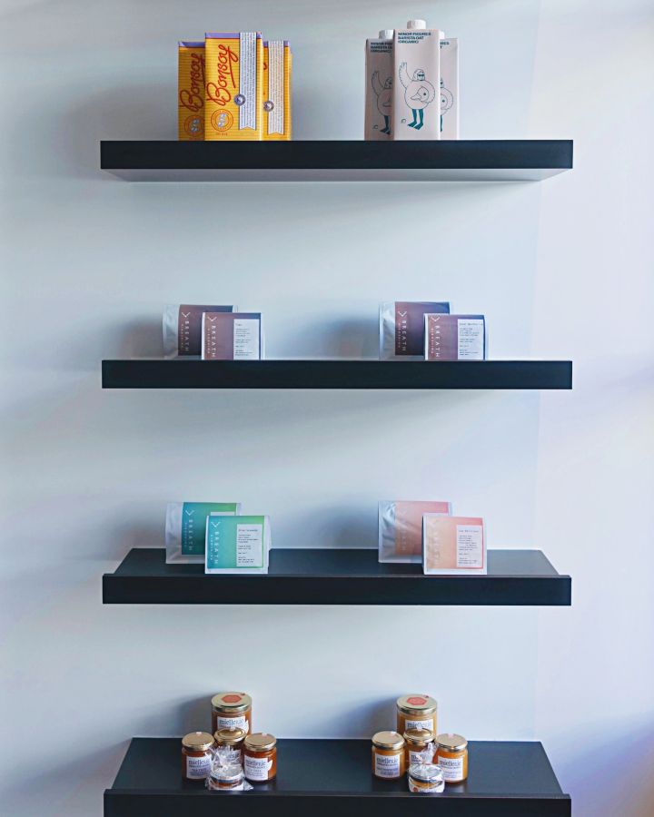 店内にディスプレイされているコーヒー豆は、オーナーの姉夫婦が広島で営んでいる「BREATH HIROSHIMA(ブレス ヒロシマ)」というロースタリーのもの。世界中から厳選した魅力的なコーヒー豆は、「UTAKATA COFFEE」のコーヒーやカフェラテにも使われています。パッケージはテイストのイメージをグラデーションカラーで表しているので、まずは好みの色で選んでみるのもおすすめ。
