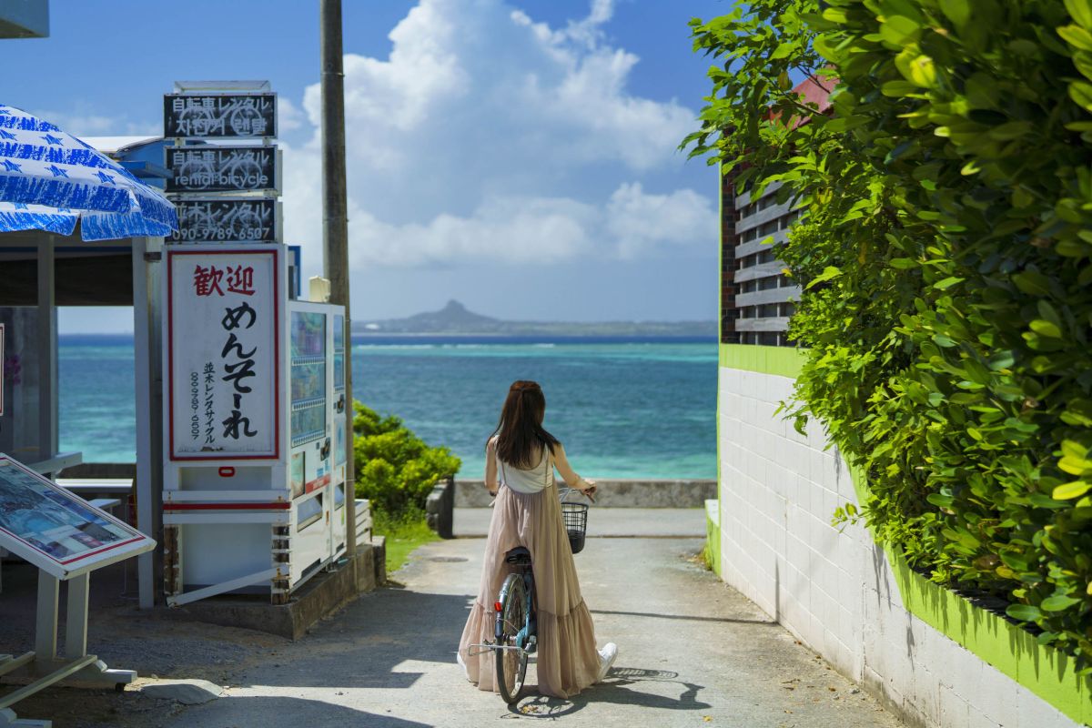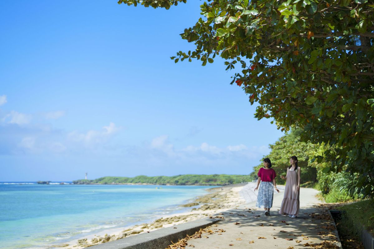 並木道を抜け、視界がパッと開けた先に海と空が広がる備瀬海岸へ。奥の半島のように見える灯台が立つ陸地は離れ小島で、その手前に海水浴やシュノーケリングスポットとして人気の「備瀬崎」、「備瀬ビーチ」があります。