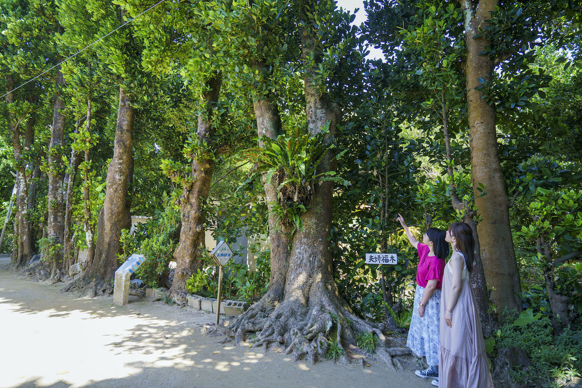続いて、そのトンネルをまっすぐ進むと現れるのが、2本のフクギが仲むつまじく寄り添って立っているようにみえることから名付けられた「夫婦フクギ」。夫婦円満や幸せを呼ぶといわれています。
