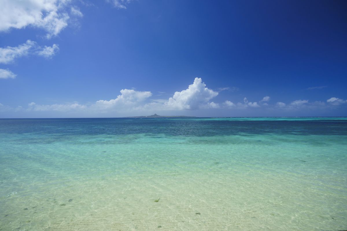 エメラルドブルーに輝く備瀬海岸の海。奥に見えるのはニョキッと山が突き出した島形が美しい離島「伊江島(いえじま)」です。