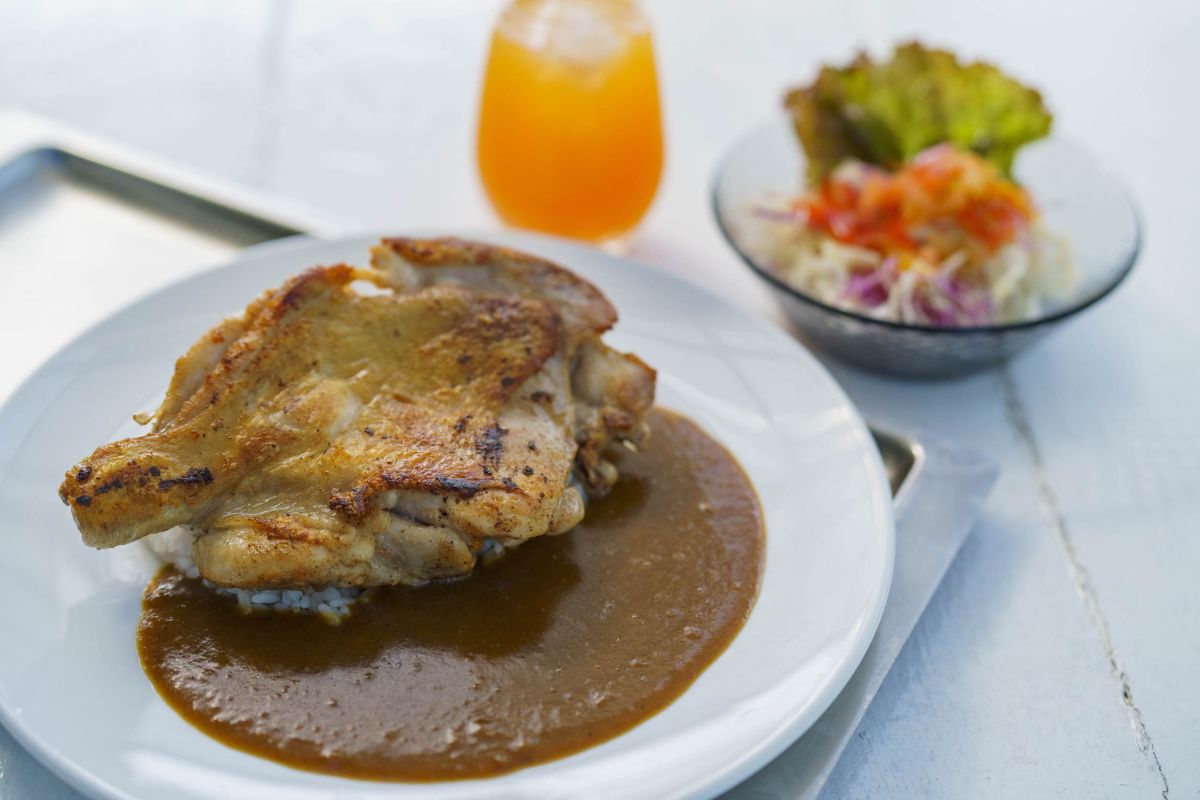一番人気はスパイスをきかせて香ばしく焼き上げたやんばる鶏を、カレーの上に豪快にのせた、「やんばる骨付鶏カレー(サラダ付き)」1560円(ドリンクセットはプラス250円)。