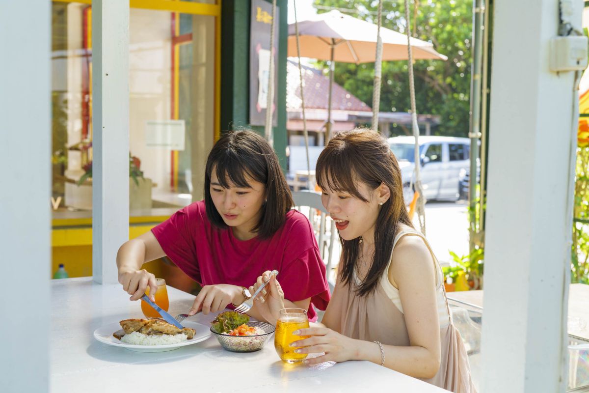 店主が旅で訪れたこの地に惚れ込み、店をオープンしたという「美ら海 café(ちゅらうみ かふぇ)」。定食、カレー、沖縄そばなど、地元食材をふんだんに使った島ごはんが楽しめます。店内は打ちっぱなしのコンクリートにテーブルやイスが置かれた、離島などでよく見られる沖縄らしい造り。外にはフクギ並木の雰囲気を感じながら料理が味わえるテラス席もあります。
