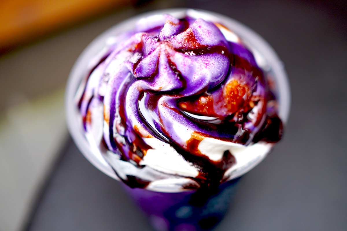 今回、ハロウィンということで見た目をより怪しくしたいなら、チョコレートソースを追加(無料)がおすすめです。紫いも×チョコレートの相性は、想像以上に◎! より飲み飽きない味わいになりました♪