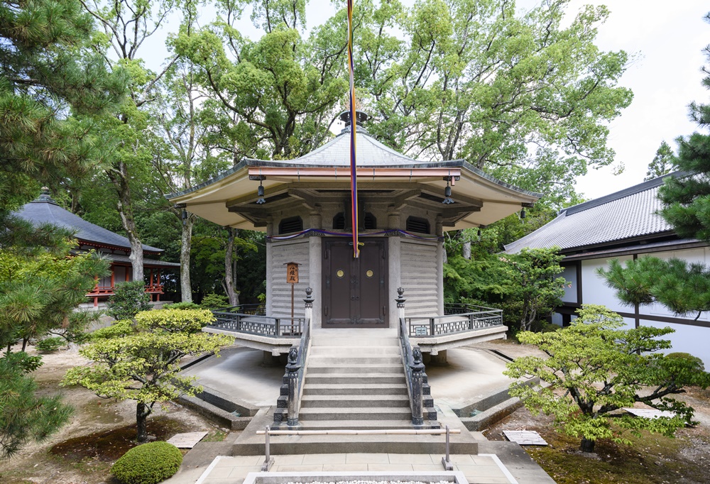 「勅封心経殿」の前にあるのが「心経前殿」。大正14年(1925)に大正天皇即位に際し建てられた饗宴殿を移築したものです。嵯峨天皇、弘法大師、後宇多法皇、恒寂入道親王の尊像を祀っているため「御影堂」とも呼ばれています。
