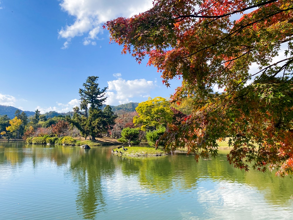 大覚寺の紅葉鑑賞の醍醐味は、やはり大沢池エリア。平安時代に唐の洞庭湖を模して造られた日本最古の林泉式庭園で、周囲約1kmの池の周りに桜や楓が700本ほど植えられています。日本三大名月観賞地であることから観月の名所として知られ、中秋の頃には「観月の夕べ」が開催されます。
