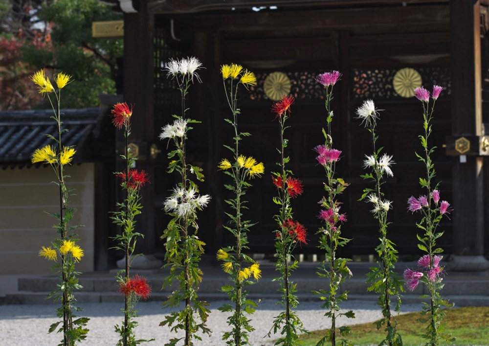 大覚寺は紅葉も美しいですが、菊の名所としても知られています。門外不出の「嵯峨菊」は、嵯峨天皇の時代から菊ヶ島に自生していた野菊。1鉢に3本植えられ、丈は殿上から鑑賞できる高さの約2mに仕立てられます。花は上が3輪、中が5輪、下が7輪で「七、五、三」の数になるように付けます。葉は下が黄、中が緑、上は淡緑と「春夏秋冬」を表す決まりです。