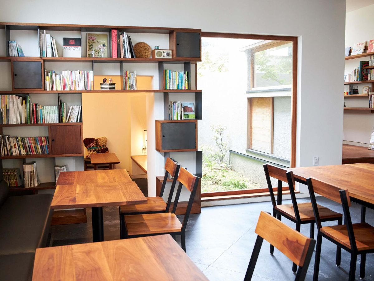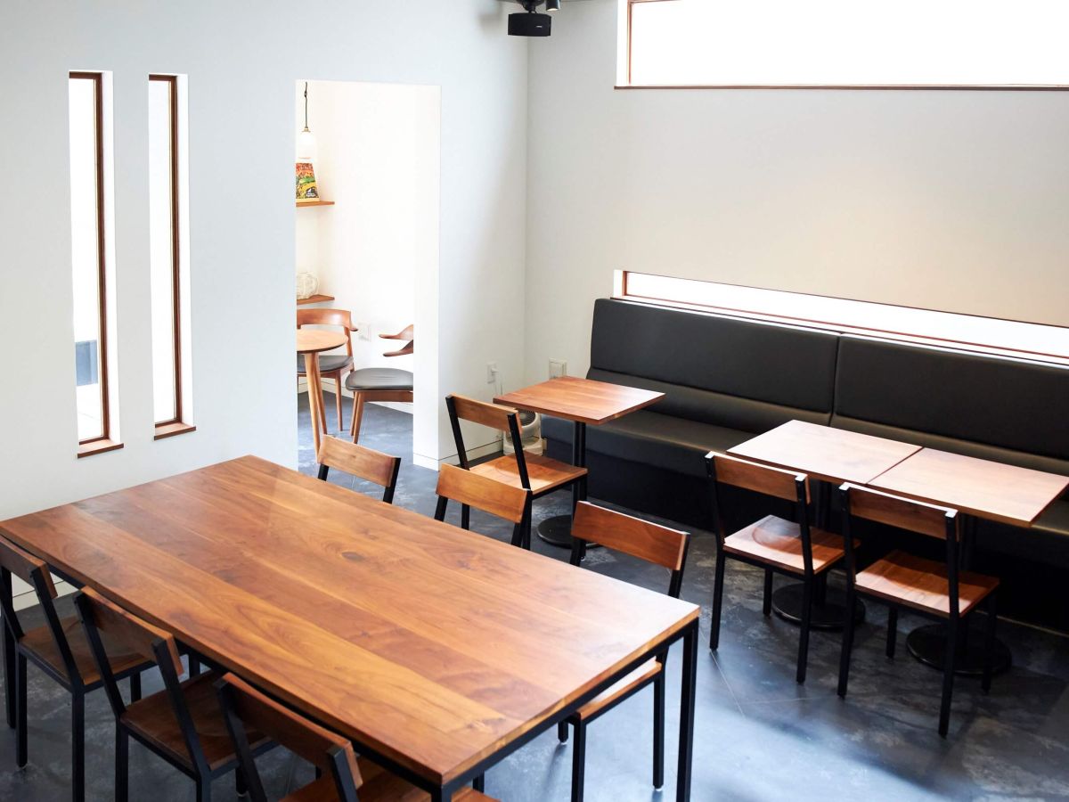 座る場所によってまったく違う雰囲気が楽しめるのも「ハセロジ」の特徴の一つです。カフェに足を踏み入れるとまず目に飛び込んでくるのがこの景色。こちらのテーブル席の空間を中心に3つの半個室が用意されています。