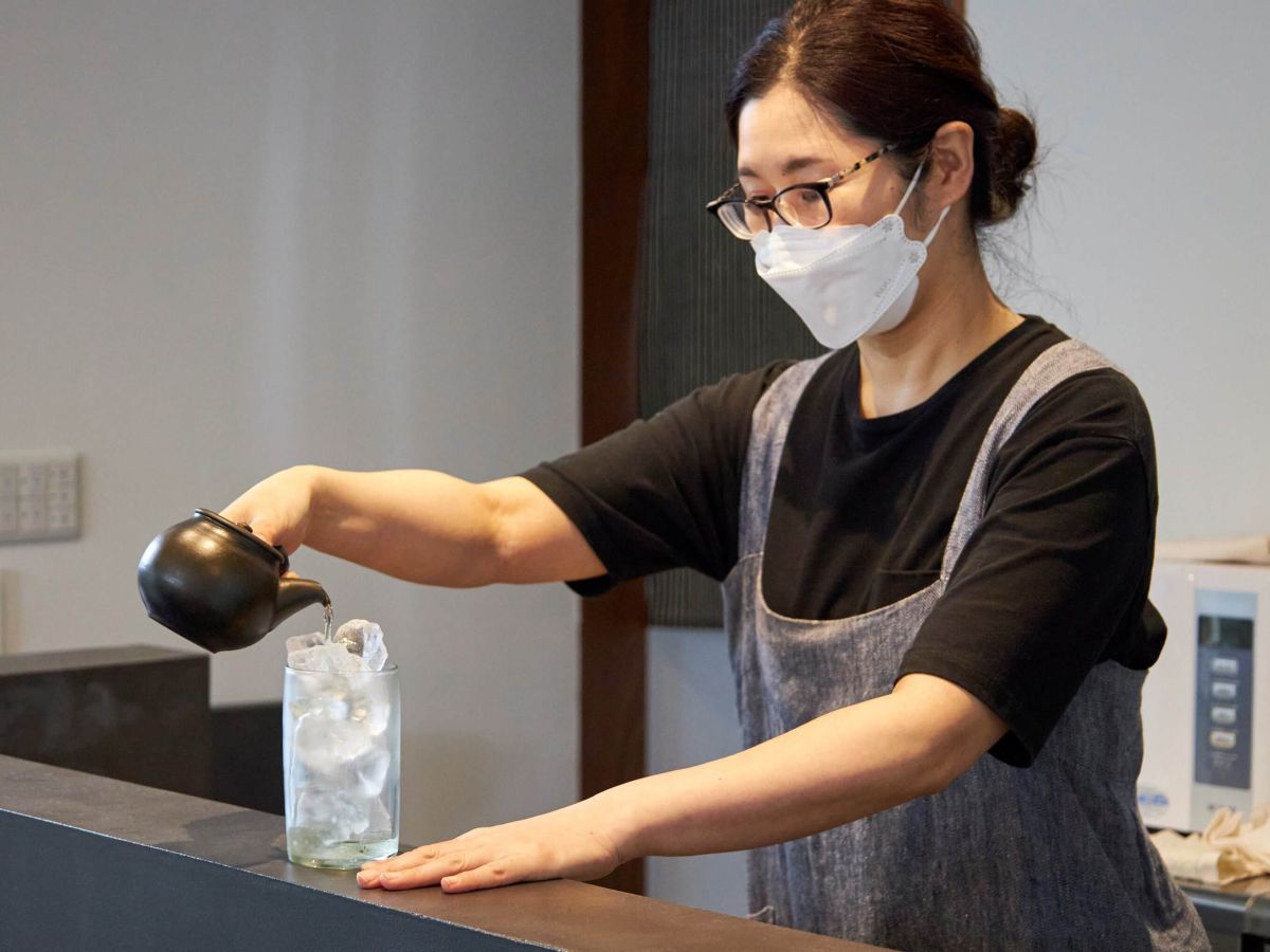 スイーツのお供に注文したのは、名古屋の老舗「升半茶店」の最上級煎茶「松濤」を使った冷緑茶です。急冷式で最後の一滴まで抽出した一杯は、濃厚なうまみと香りを余すことなく味わえ、「季節のおやつ」とも好相性です。