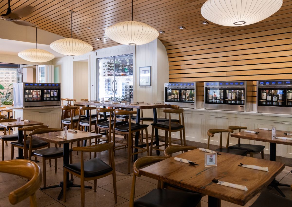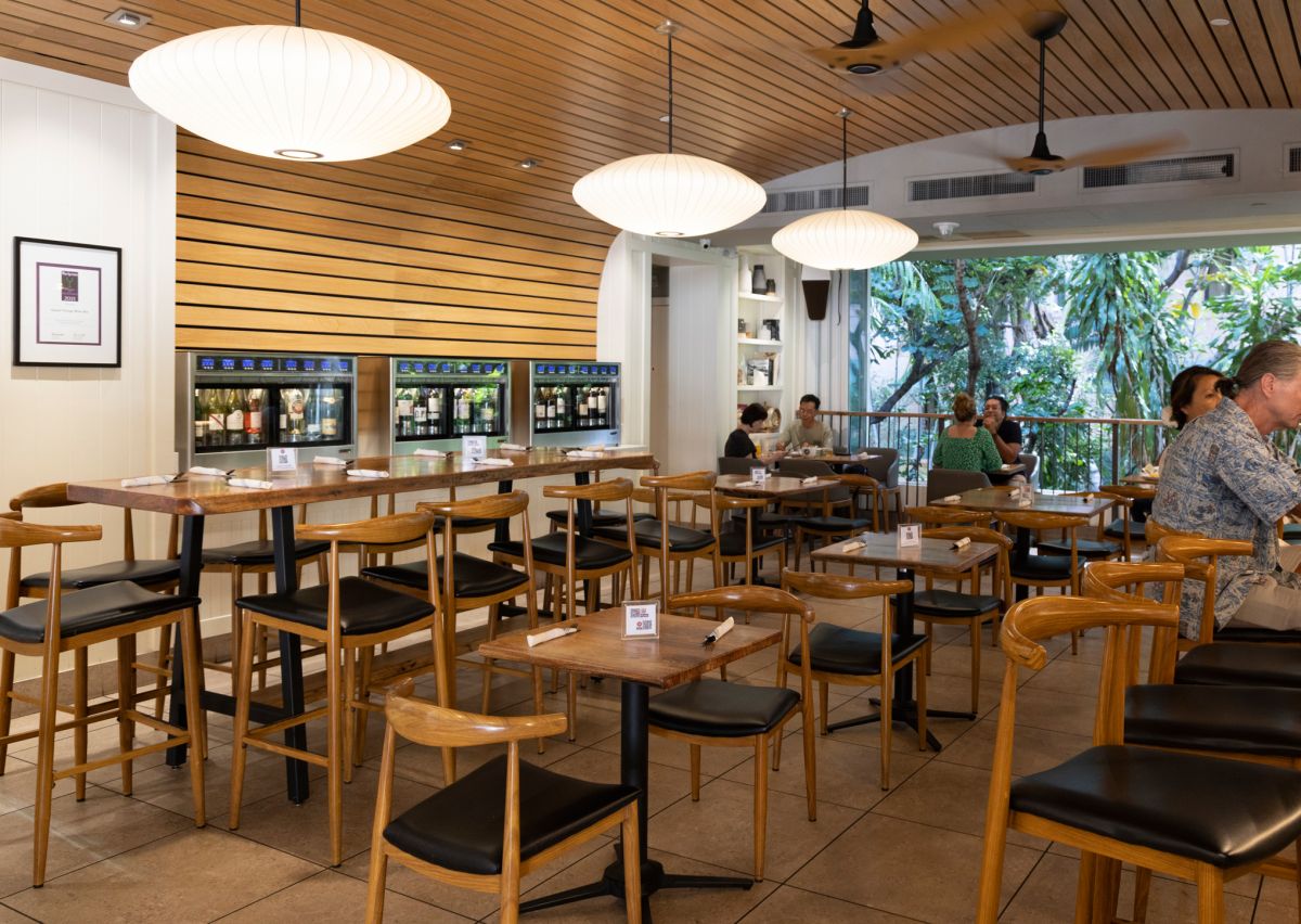 「アイランド・ヴィンテージ・ワインバー」は、大人気のカフェ「アイランド・ヴィンテージ・コーヒー」の隣に位置する、2019年8月にオープンしたお店です。入り口の間口が広く、通路側のテラス席の他、奥にはテーブル席やカウンター席もあり、ハワイの風が吹き抜ける店内はウッディーで落ち着いた雰囲気。朝7時から夜22時まで営業しているので、朝食からディナーまでゆったりと食事をいただくことができます。