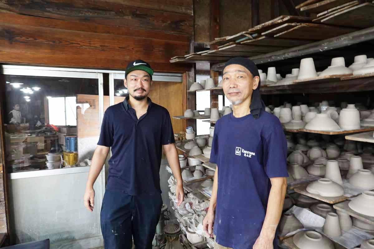 角山製陶所の5代目と6代目。ユーモアを交えた楽しい会話が評判で、リピーターも多いです。スマホやカメラを渡せば、体験している様子を撮影してくれます。