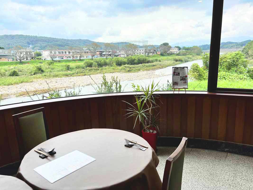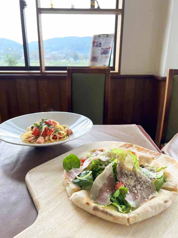 大きな窓から土岐川がゆっくりと流れる風景を眺めながら、料理を楽しめます。「ランチコース」1750円は、メインを季節ごとに変わるパスタやピッツァ、パニーニの6種類から1つ選べます。