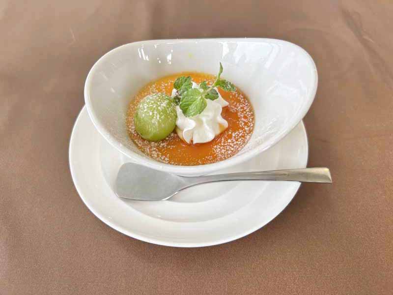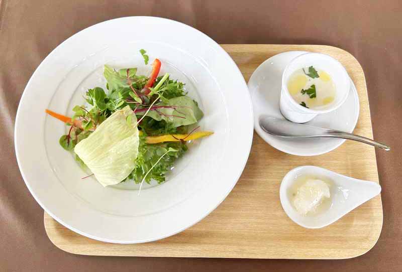 まずは前菜から。季節野菜の彩りパスタと野菜のポタージュ、鮮魚のマリネです。どれもシンプルな味付けで、素材の味を感じます。自家製の天然酵母を使用したパンもついています。