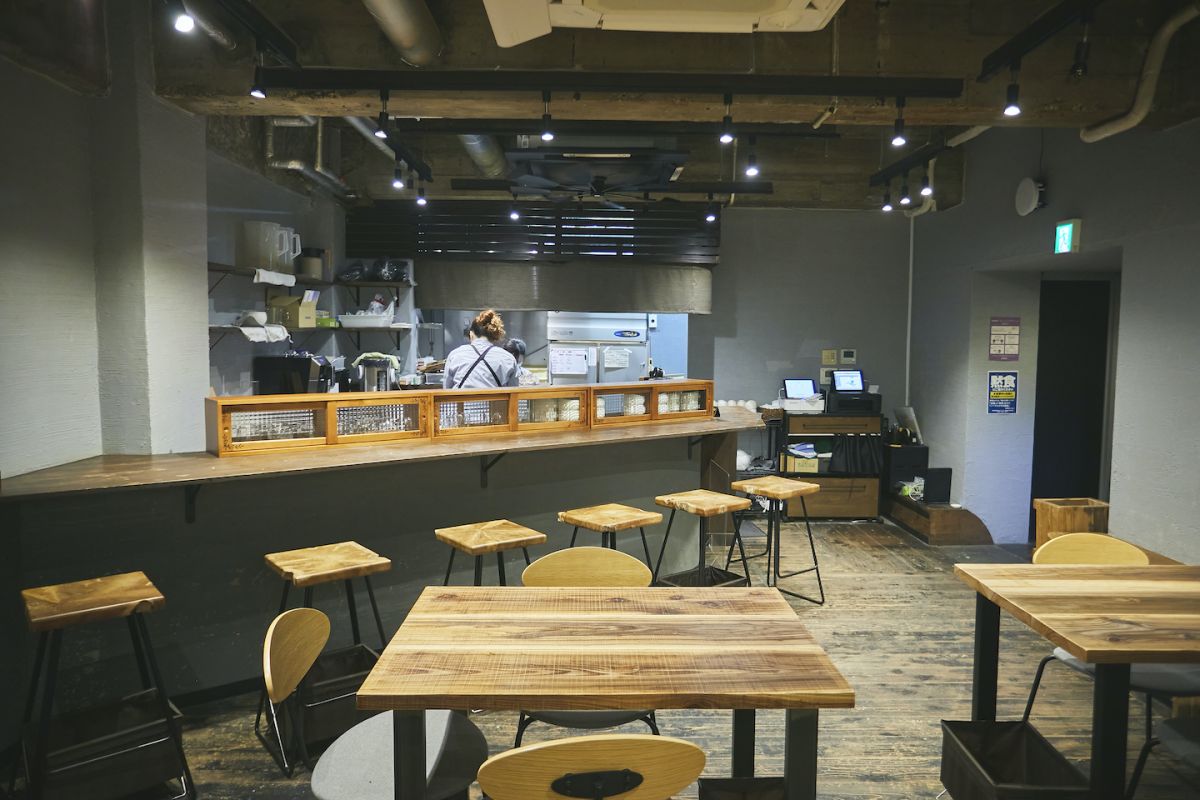 壁のグレーを基調に、木の素材感が温かみを添える店内。テーブル12席とカウンター6席の計18席あります。