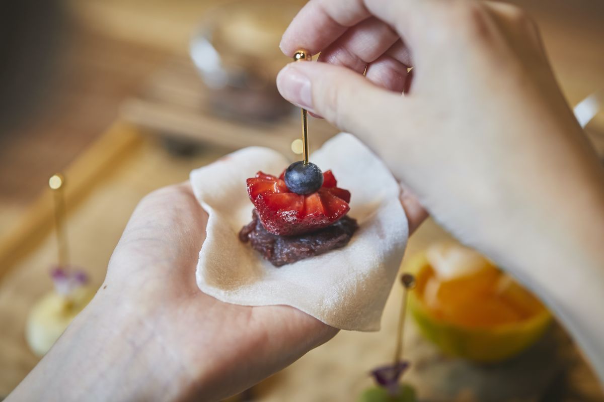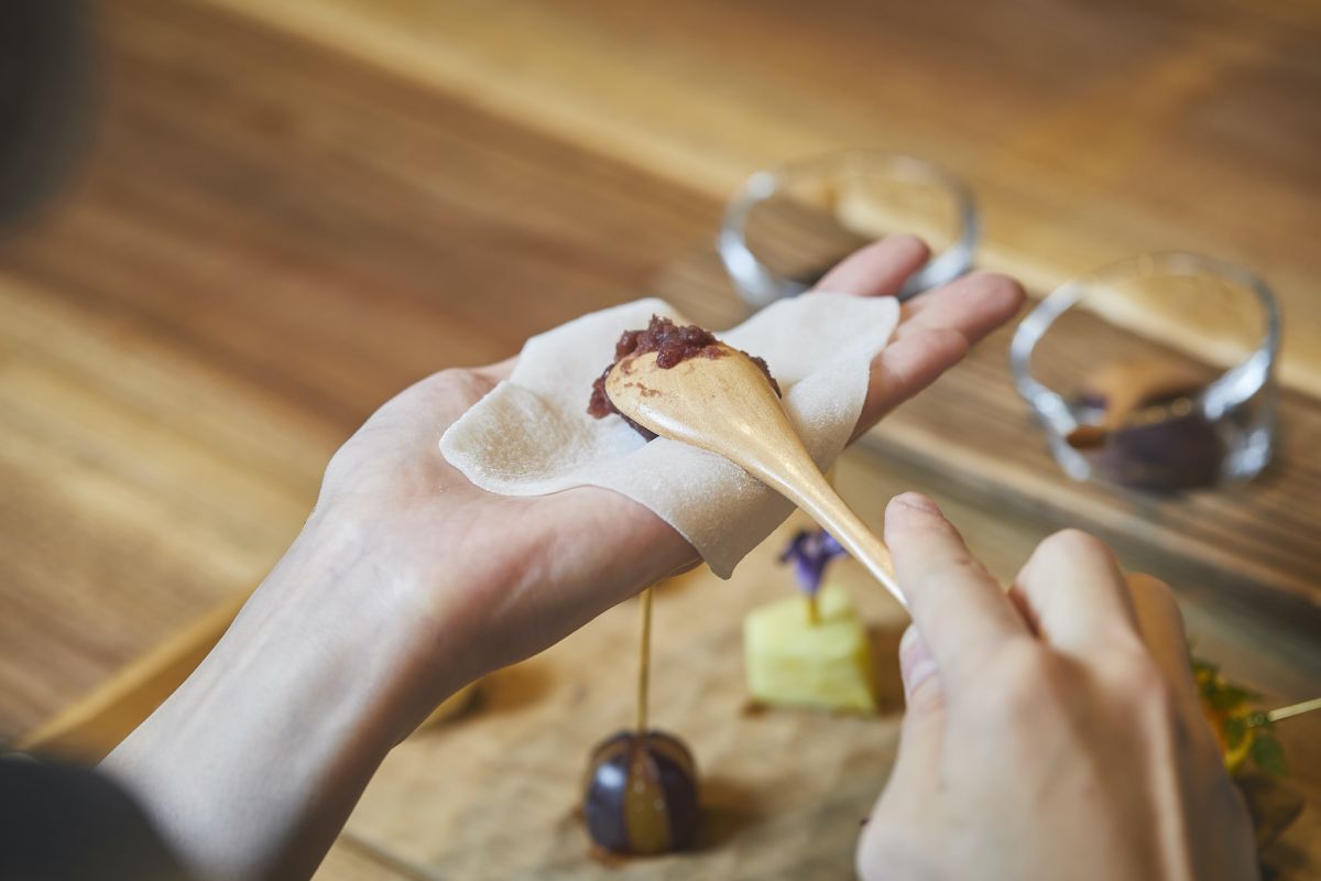 作り方は簡単。手のひらに求肥の皮を載せて、その上に餡子、フルーツを重ねて対面の角を真ん中に寄せて合わせます。餡子を2種類ミックスしたり、カットされたみかんをほかのフルーツに合わせたり、アレンジは自由自在。
