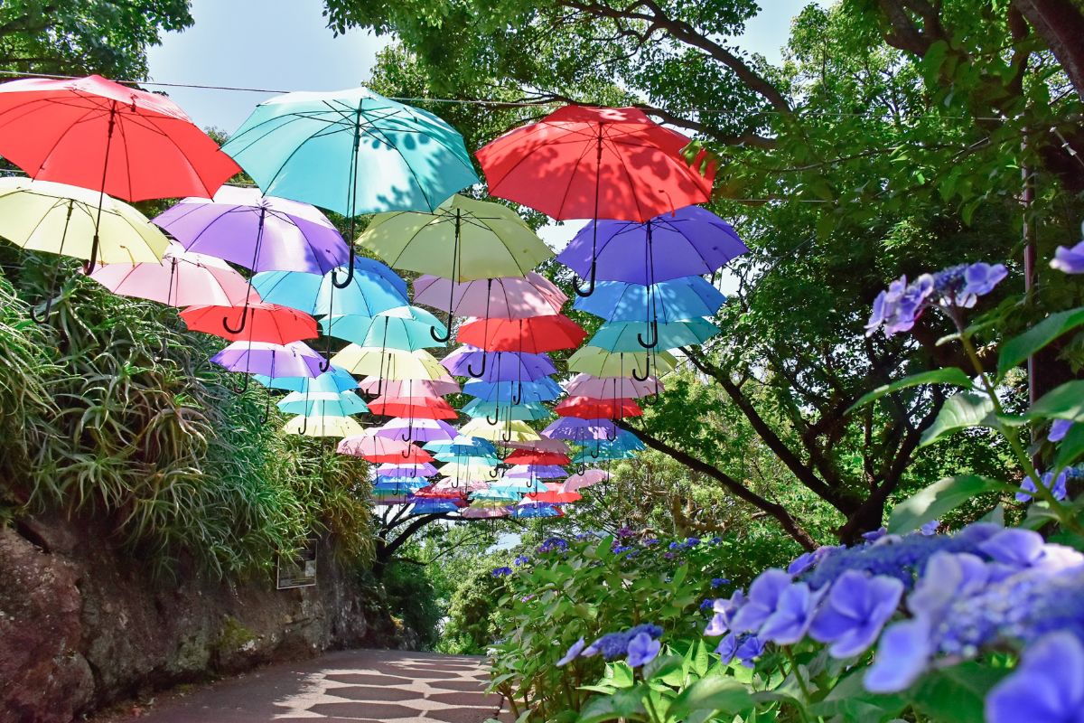 園内を一周する遊歩道の途中には、海を見渡す展望台や、写真好きにぜひ押さえてほしい「アンブレラスカイ」などのみどころがいっぱい。