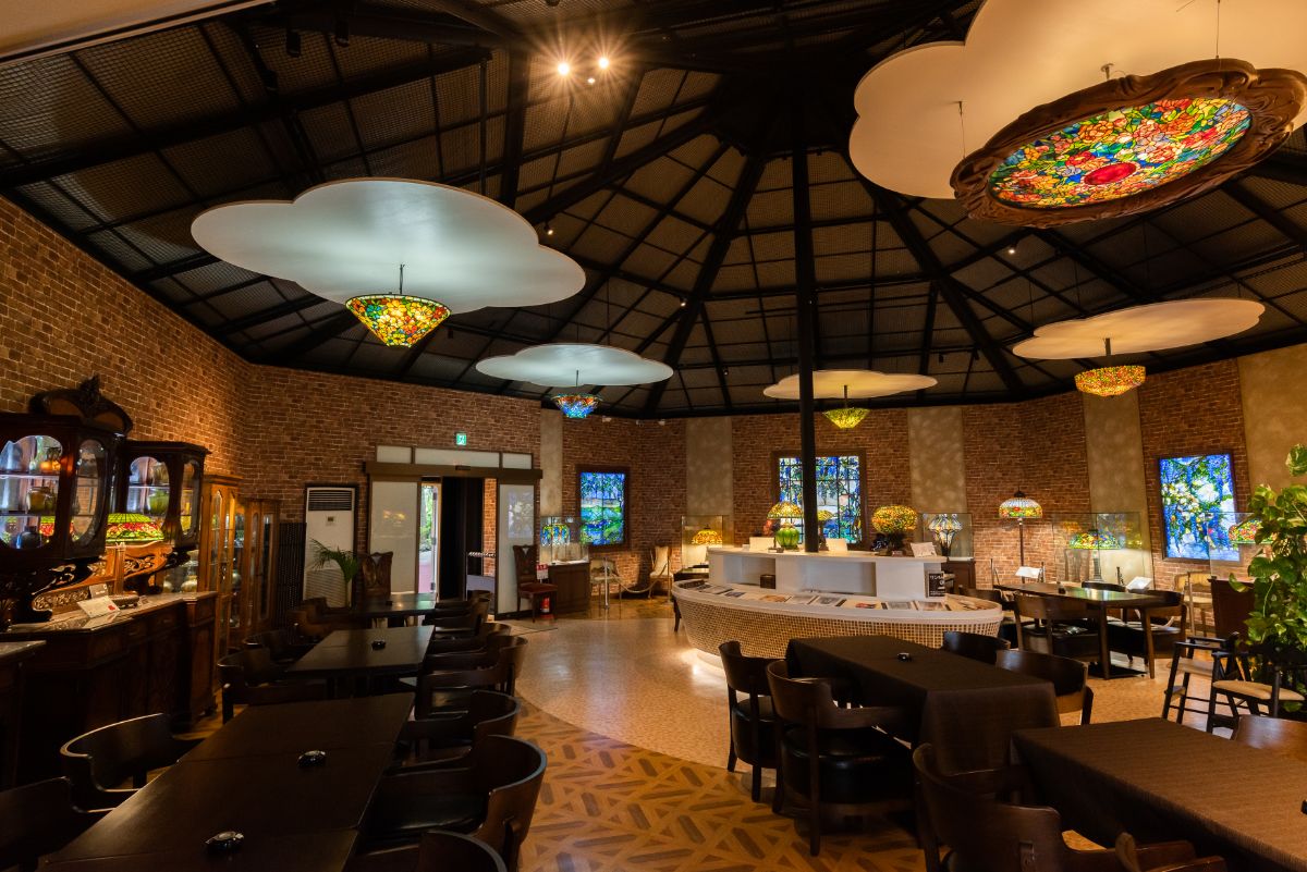 芸術に触れた後は、ミュージアムの別館&カフェで優雅なティータイムを。こちらのカフェでは、ティファニーの作品を眺めながら、お茶や食事を楽しむことができるんです。