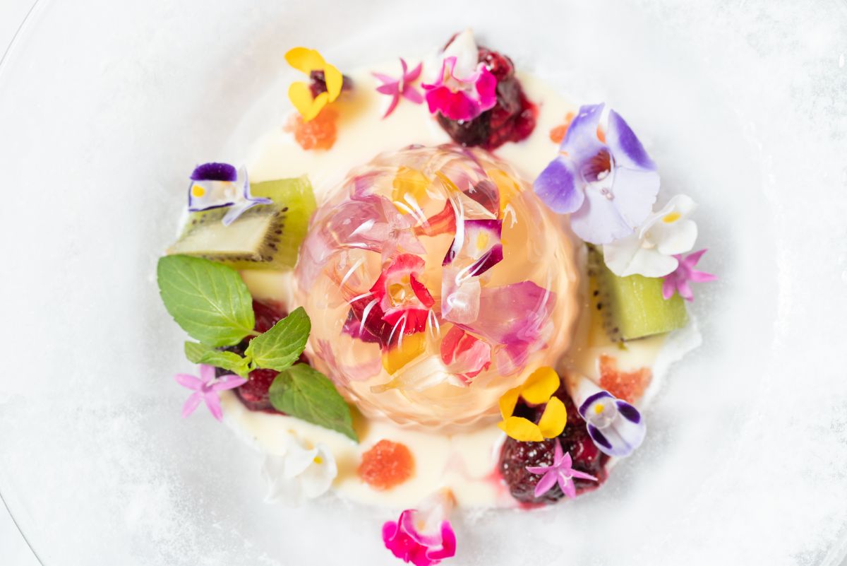 いつまでも眺めていたくなるようなビジュアルはもちろん、味のバランスも絶妙。食べられる花であるエディブルフラワーをふんだんに使った、目で楽しみ舌で味わう、最後の一口まで飽きない一品です。