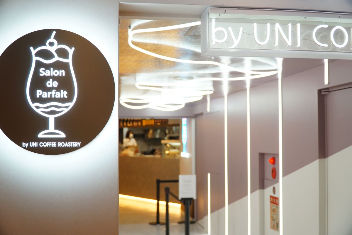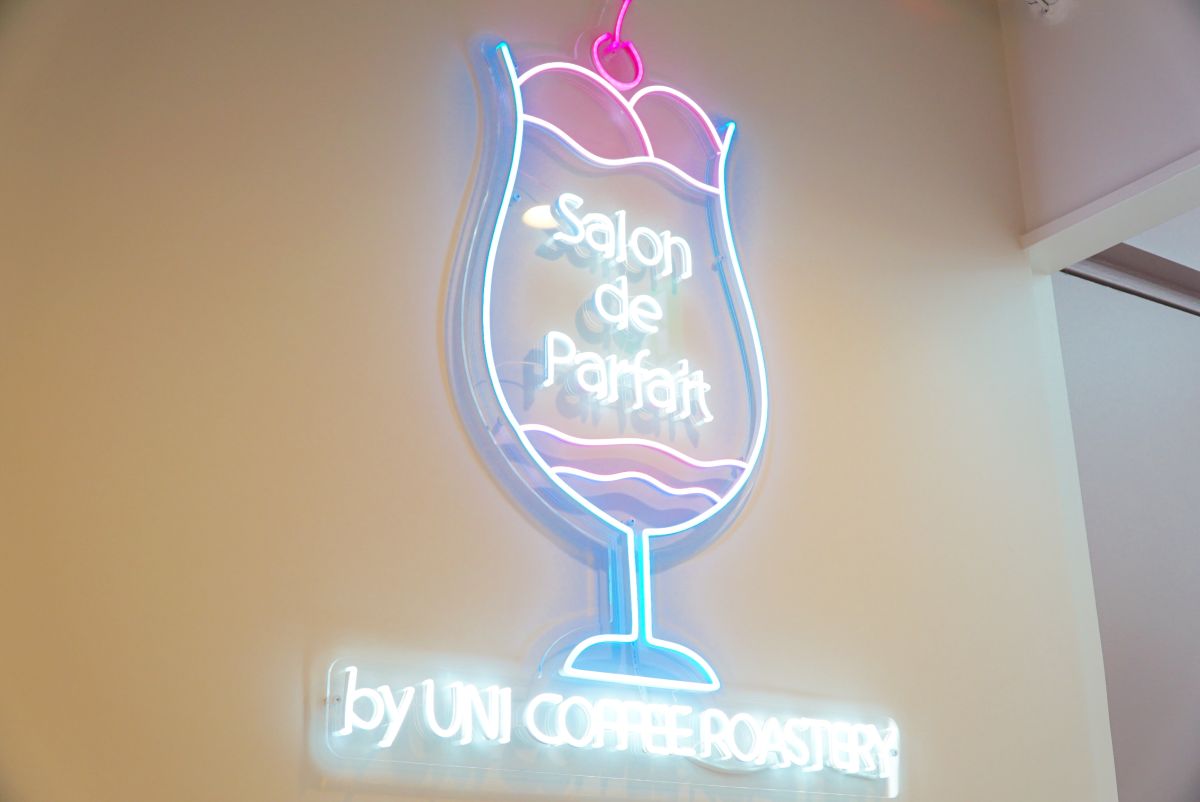 「UNI COFFEE ROASTERY」の系列店にはそれぞれにテーマがあり、「サロン ド パルフェ by UNI COFFEE ROASTERY」は同店が手がける初のパフェ専門店です。エントランスにもキュートなパフェのサインが。