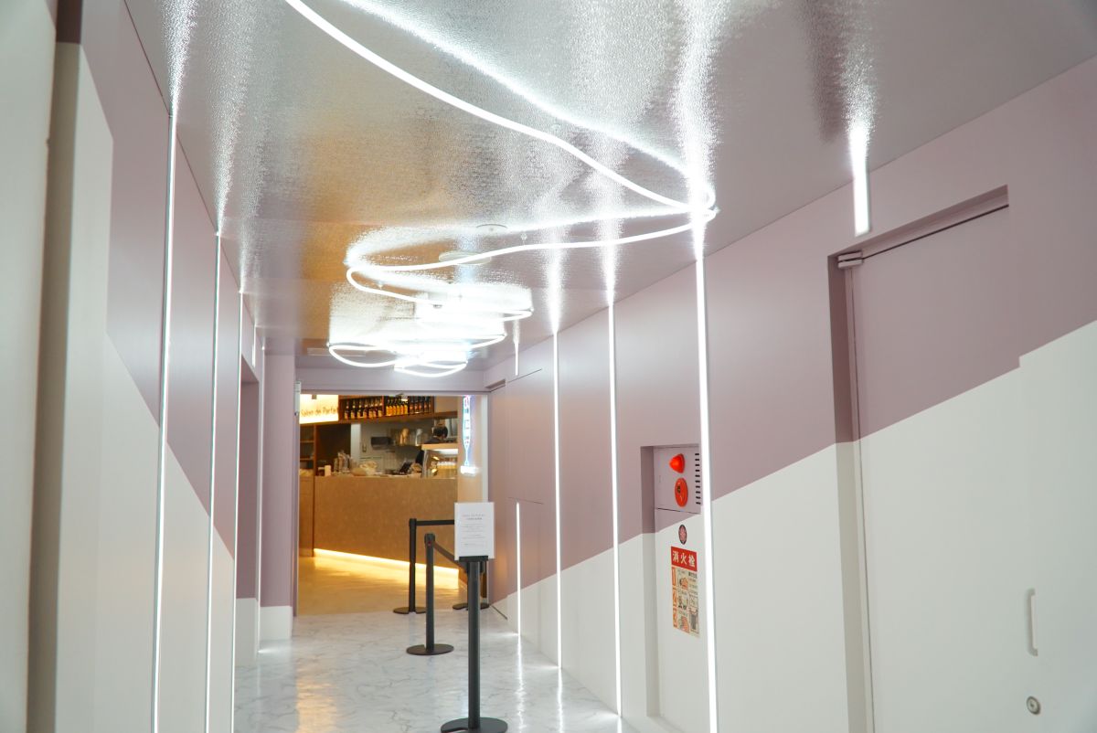 店内へと続く通路を歩いていきます。天井に配されたおしゃれなネオンが店内へと誘う道標のようで、この先にはどんな空間が広がっているんだろう…と期待が高まります!