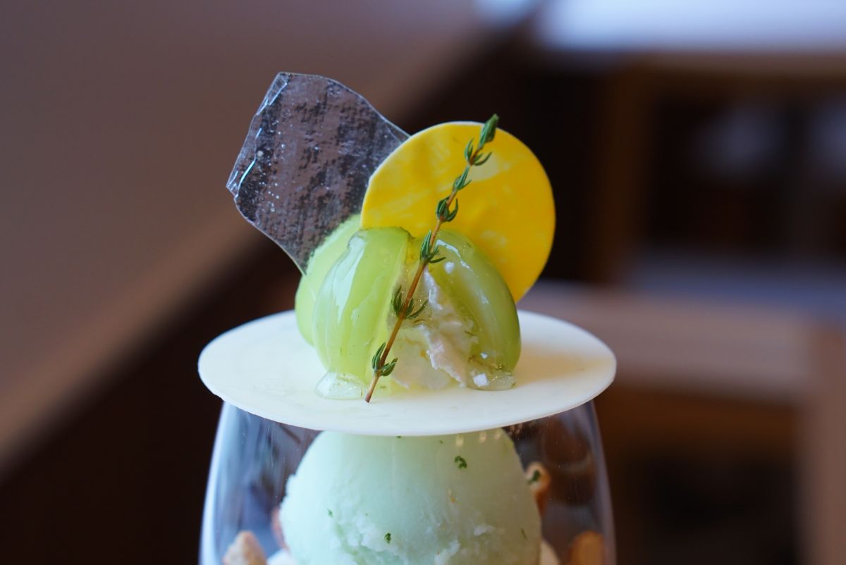 ワイングラスのなかとその上に飾り付けられたパフェはまるで宝石のような美しさで、食べるのがもったいないほど。ホワイトチョコレートの蓋の上にはシャインマスカットとキャンディ、クリームがのせられています。ハーブのタイムもアクセントになっていてこれぞ大人のパフェといった味わいです。