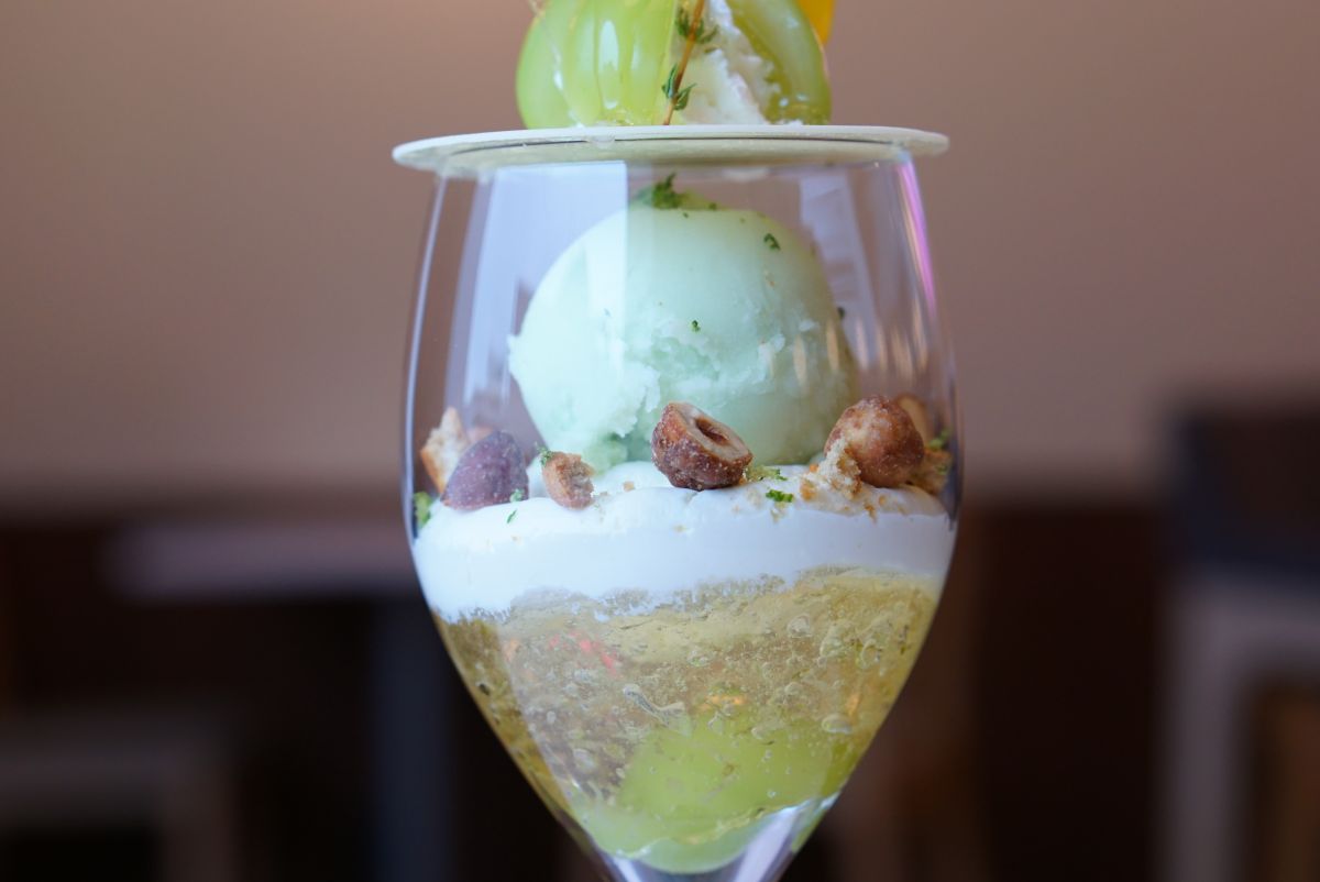 グラスの中にはマスカットジェラート、ナッツ、チーズムース、ホワイトワインジュレが美しい層を成しています。ほんのりお酒の香りが感じられるホワイトワインジュレは、マスカットジェラートとの相性も抜群。全体的に甘さは控えめで手頃なサイズ感なので、食後のスイーツにぴったりです!