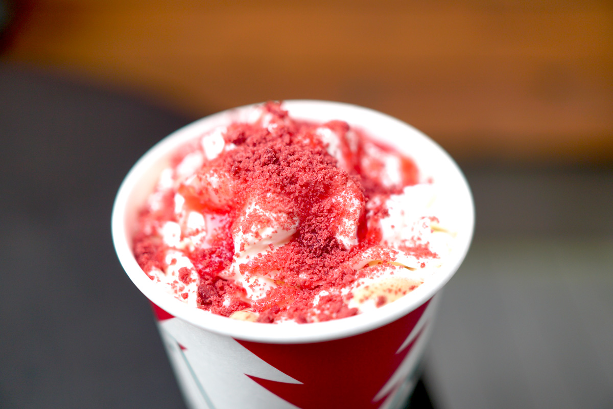 「ストロベリー & ベルベット ブラウニー フラペチーノ®」のモチーフは、アメリカで定番スイーツとして親しまれる「レッドベルベットケーキ」。真っ赤なスポンジと真っ白なホイップクリームのコントラストが特徴的なケーキです。ベルベットの由来は諸説ありますが、なめらかな口当たりにあるのだとか。
