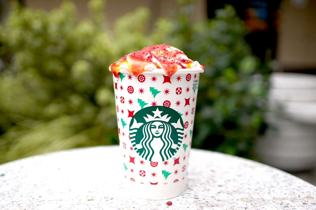 フラペチーノの作り方は、チョコレート味のブラウニーをまるごと1個入れて、ミルクと氷、シロップをブレンド。それをストロベリー果肉の入ったカップに注ぎ入れて、ホイップクリームの上に、艶めく真っ赤なストロベリーグラサージュソースを回しかけ、ゴールドのチョコレートトッピングを飾って完成です。ビジュアルは、華やかな赤と白のクリスマスツリーみたい!