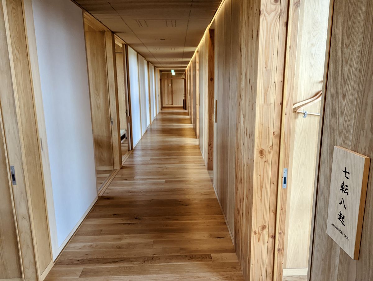 さっそく建物の中へ。建物の85%に木材を採用しているだけあり、廊下を歩いているだけで、杉の香りに癒やされます。