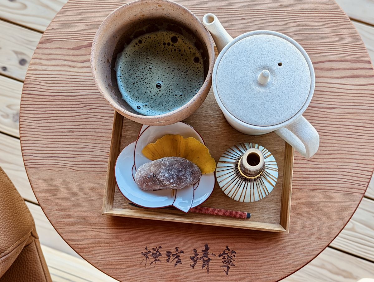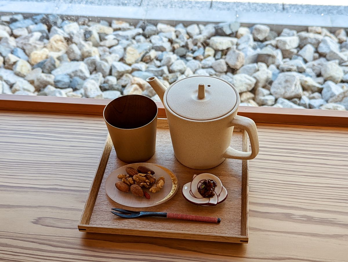 食後は、「ZEN 茶」セットを受け取り、館内の好きな場所で“お抹茶タイム”。お茶は一般的に客人をもてなすために淹れるものですが、ここでは自分自身を癒やすために一服たてます。