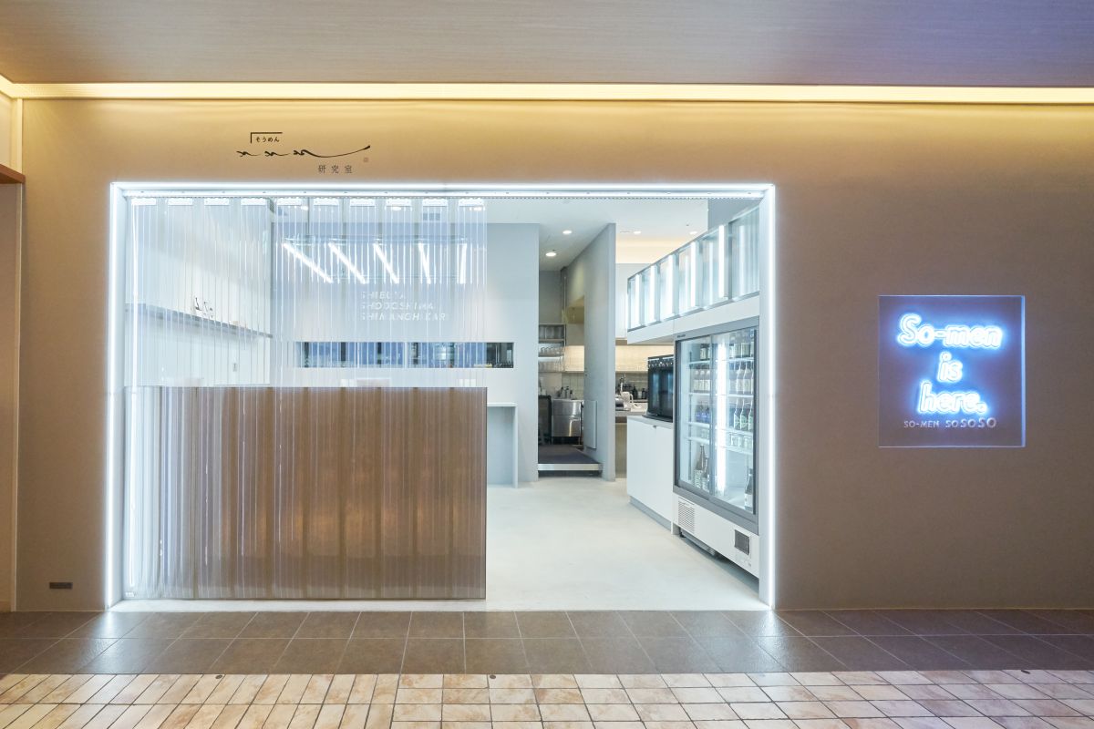 店内は、まさに“研究室”をイメージした無機質な雰囲気。一方で、そうめんを思わせるような直線的なライトや写真映えするネオンサインが設置されていて、遊び心のあるクリーンでアートな空間になっています。