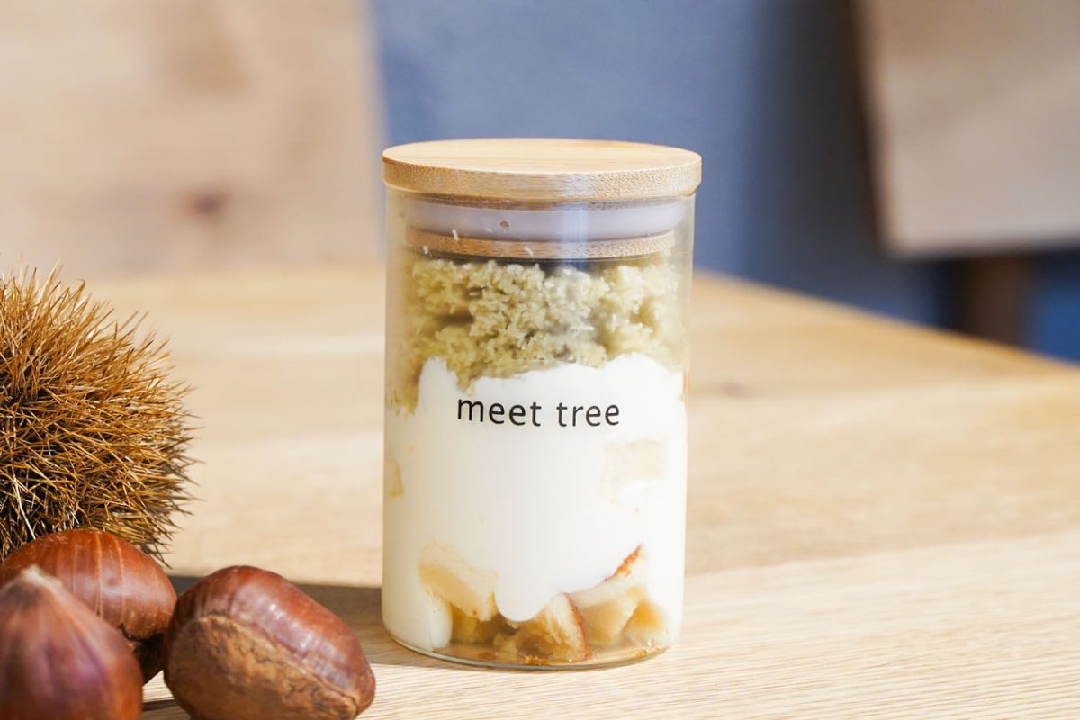 岐阜県内有数の栗の産地として名高い中津川市に、木の温もりあふれる空間で、こだわりの栗スイーツを堪能できるカフェがあります。最大2時間待ちの行列ができるほどの人気店「meet tree Café NAKATSUGAWA(みーと とぅりー かふぇ なかつがわ)」が、今シーズン新しくリリースしたテイクアウト専用モンブランが「NAKATSUGAWA 栗粉モンブラン〜極 0.3mm〜」です。