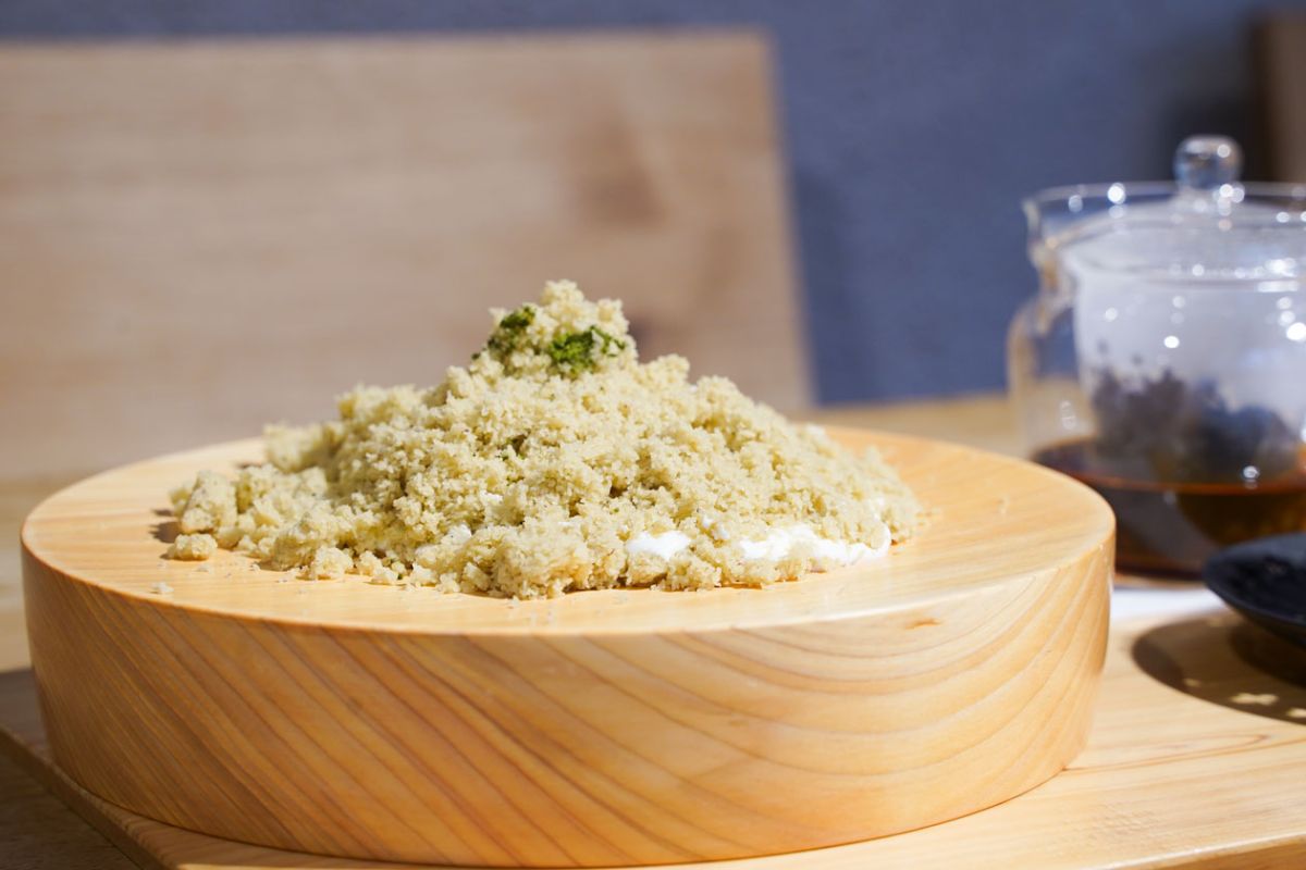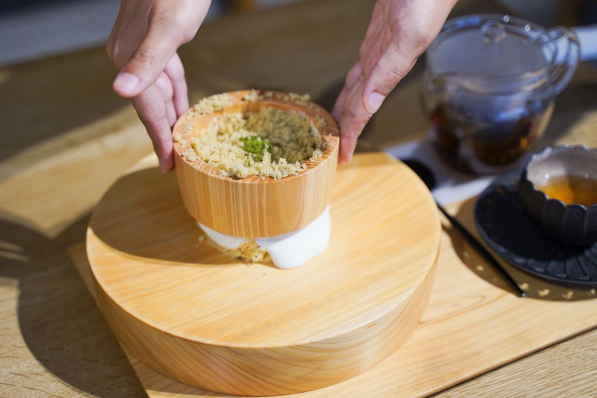 地元の和菓子店のカステラと純生クリームが重なり、その上にはふわふわの栗粉、そして頂上には全体の味をまとめる抹茶塩がまぶされ、見た目のボリュームに反して、とても上品な味わいです。