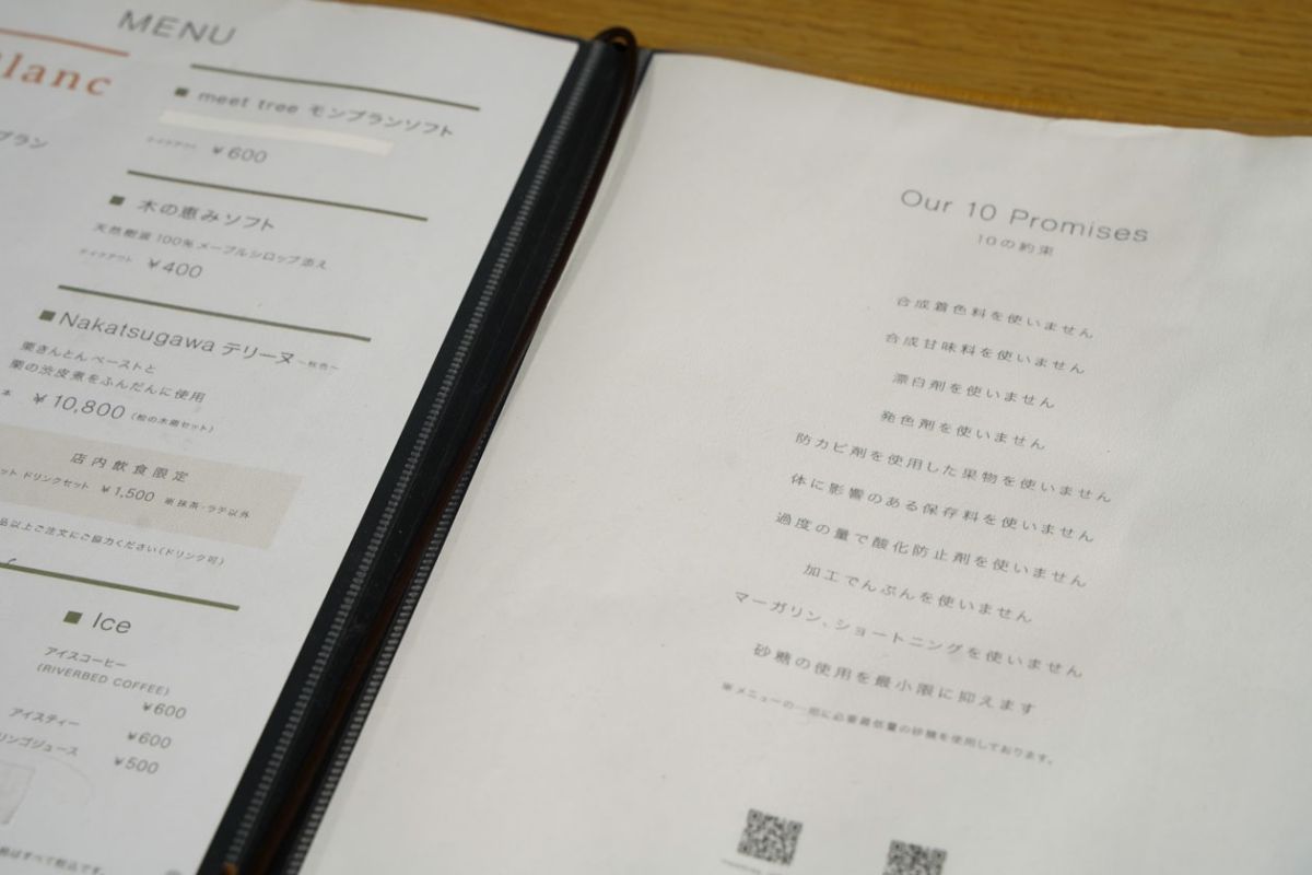 「meet tree Café NAKATSUGAWA」では、人と環境に配慮して10の添加物の不使用を宣言しています。例えば、できる限り上白糖ではなく、身体にやさしいきび砂糖を使用していたり、生クリームは動物性100%にこだわるなど、その徹底ぶりはもともとが地域環境と密接につながり歩んできた会社だからこそ。