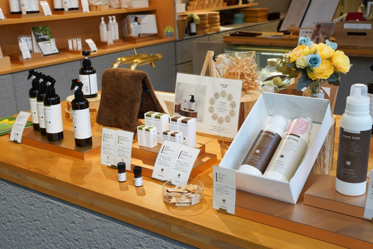 店頭では、カフェと同じmeet treeブランドのライフスタイル雑貨も販売しています。シャンプーやボディソープ、ヒノキの精油など、自分へのご褒美や贈り物にぴったりな商品が並んでいますので、訪れた際にはぜひ手に取ってみてくださいね。