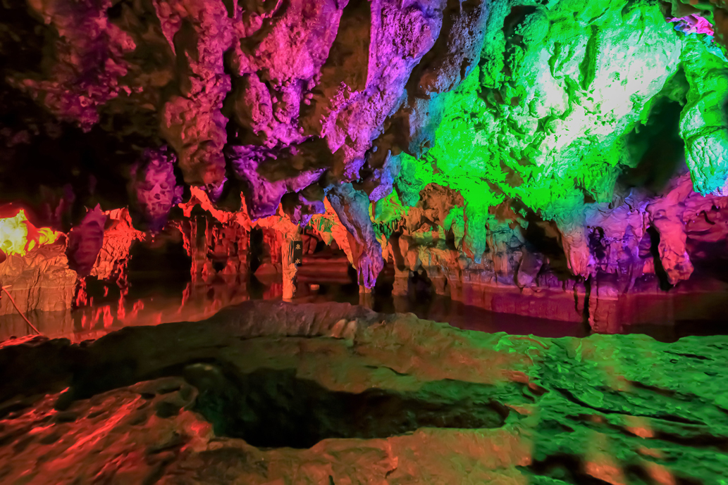 薪の洞内は総延長約450m。水雫の音が響き渡る洞内はとってもミステリアス。刻々と色が変わるライトアップがファンタジックで、アニメやゲームの世界へ誘われているような気分になりました。