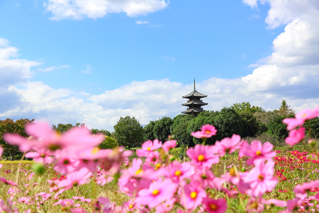 なかでもひと際目を引くのは、田んぼに囲まれた「備中国分寺」の五重塔。周辺の自然は季節ごとに目まぐるしく変化し、来るたびに違った表情を見せるのも魅力。今回はコスモスが彩りを添える秋に伺いました。