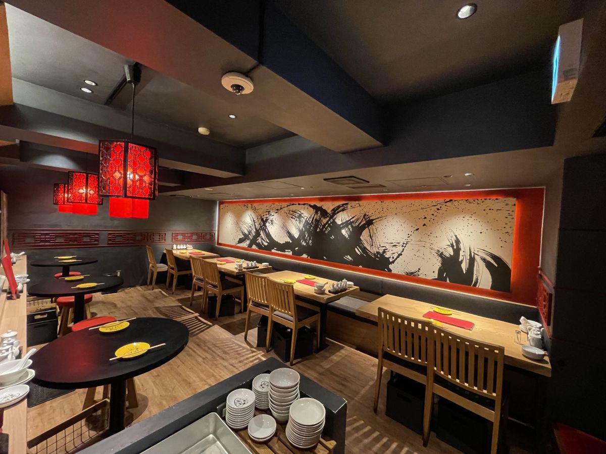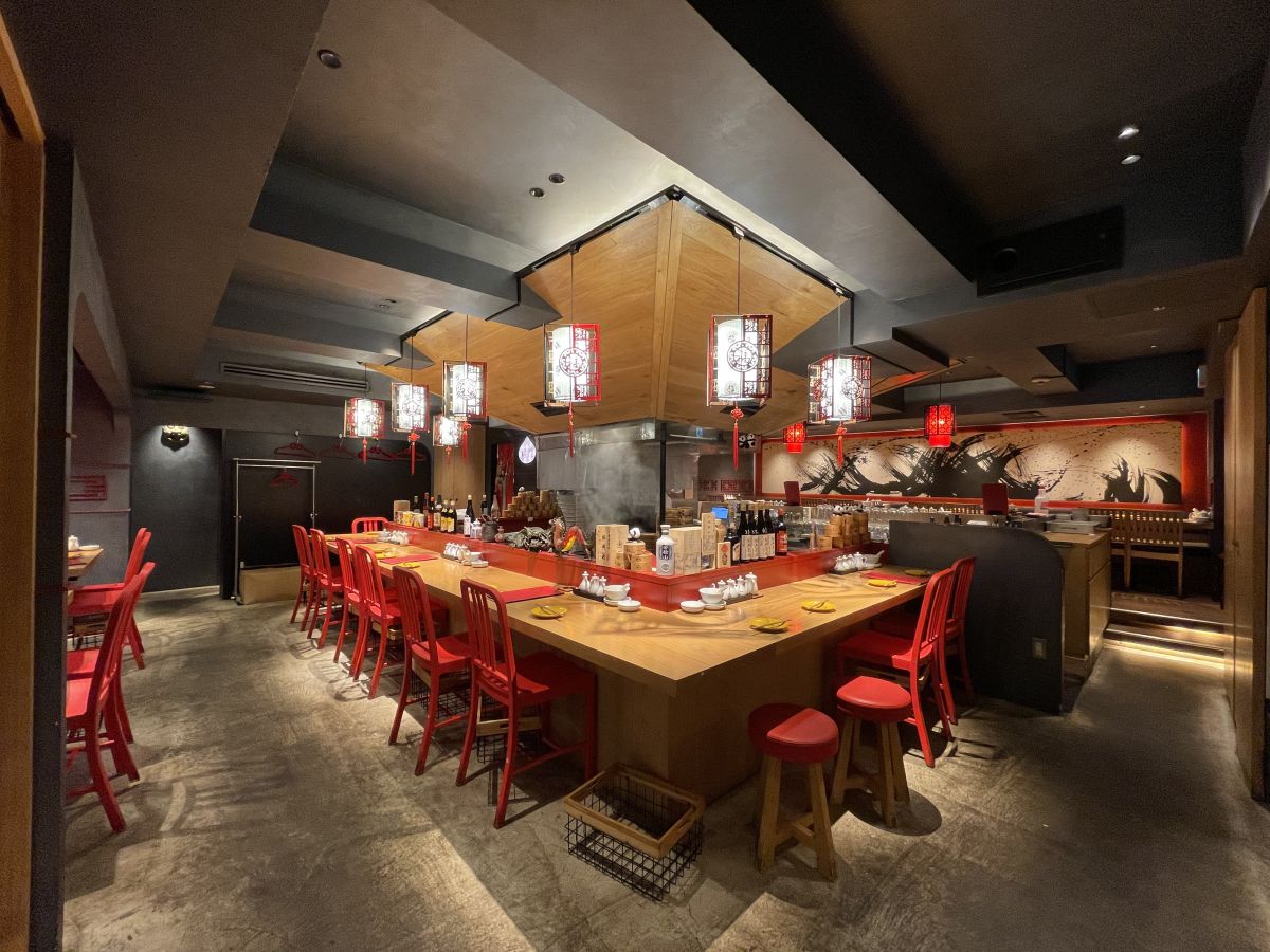 店内の中央をぐるっと囲むカウンター席と、赤いインテリアが印象的です。