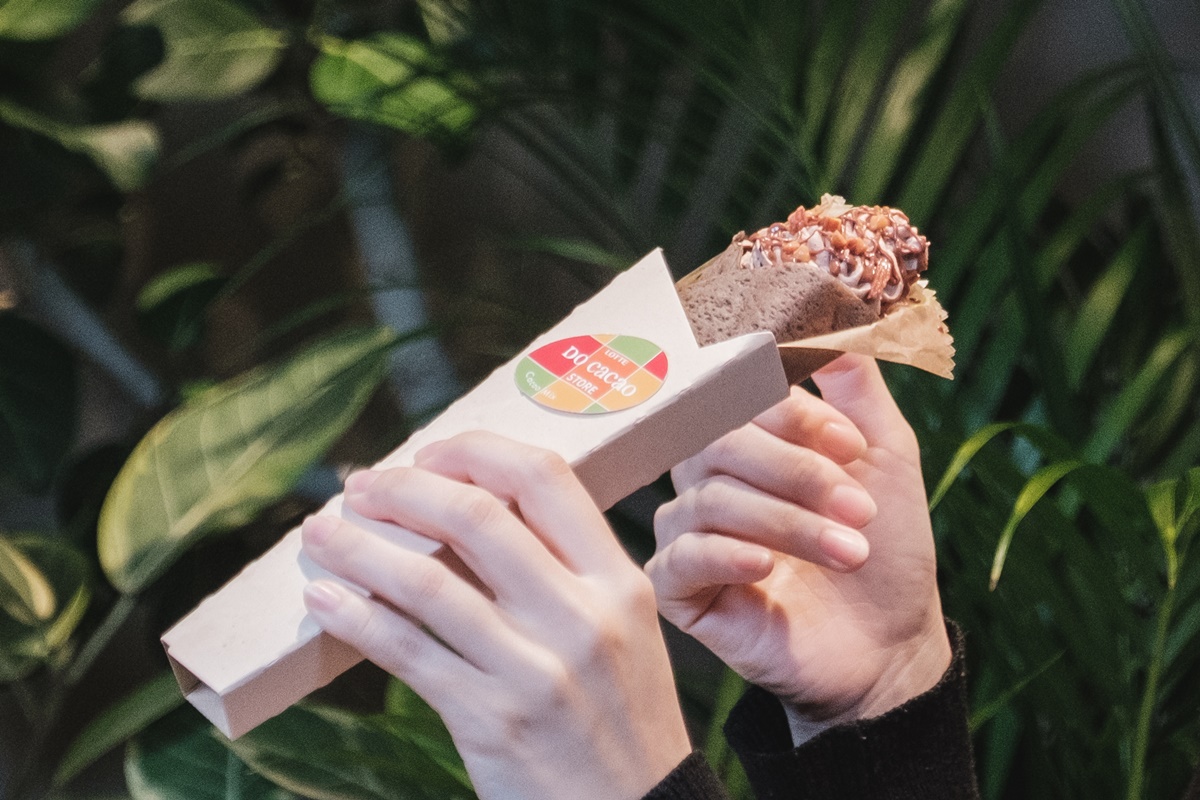 カカオ風味のクレープ生地の中は二層になっていて、上の部分にはパプアニューギニア産カカオのソースと香ばしいナッツ、カラメルソースをまとったバナナが、下にはインドネシア産カカオのソースを合わせた甘酸っぱいミックスベリー、さらにガーナ産カカオのクリームが隠れています。食べる場所によって異なる味わいを楽しめるため、ホットドッグのように垂直に持って食べるのがベター。