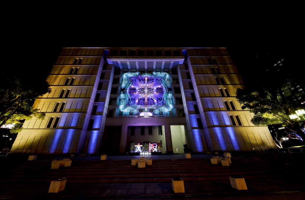 大阪市役所正面では、「OSAKA光のルネサンス」の周年を祝福する玄関イルミネーションファザードを実施。「ひろがる絆」をコンセプトに人と人との繋がりを表す光の八角形の中心に「大阪・光の饗宴」のロゴを点灯させます。