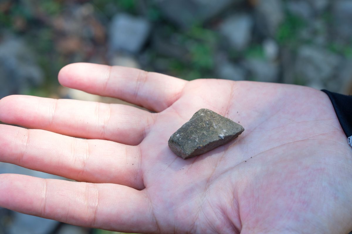 「この辺りは、発掘調査が行われていないため古銭や陶器の欠片が時々見つかります。あっ!ちょうどここにもありましたね。これは中国の陶磁器の破片で約600年前のものだと思われます。たとえ見つけても持ち帰らないで下さいね。」