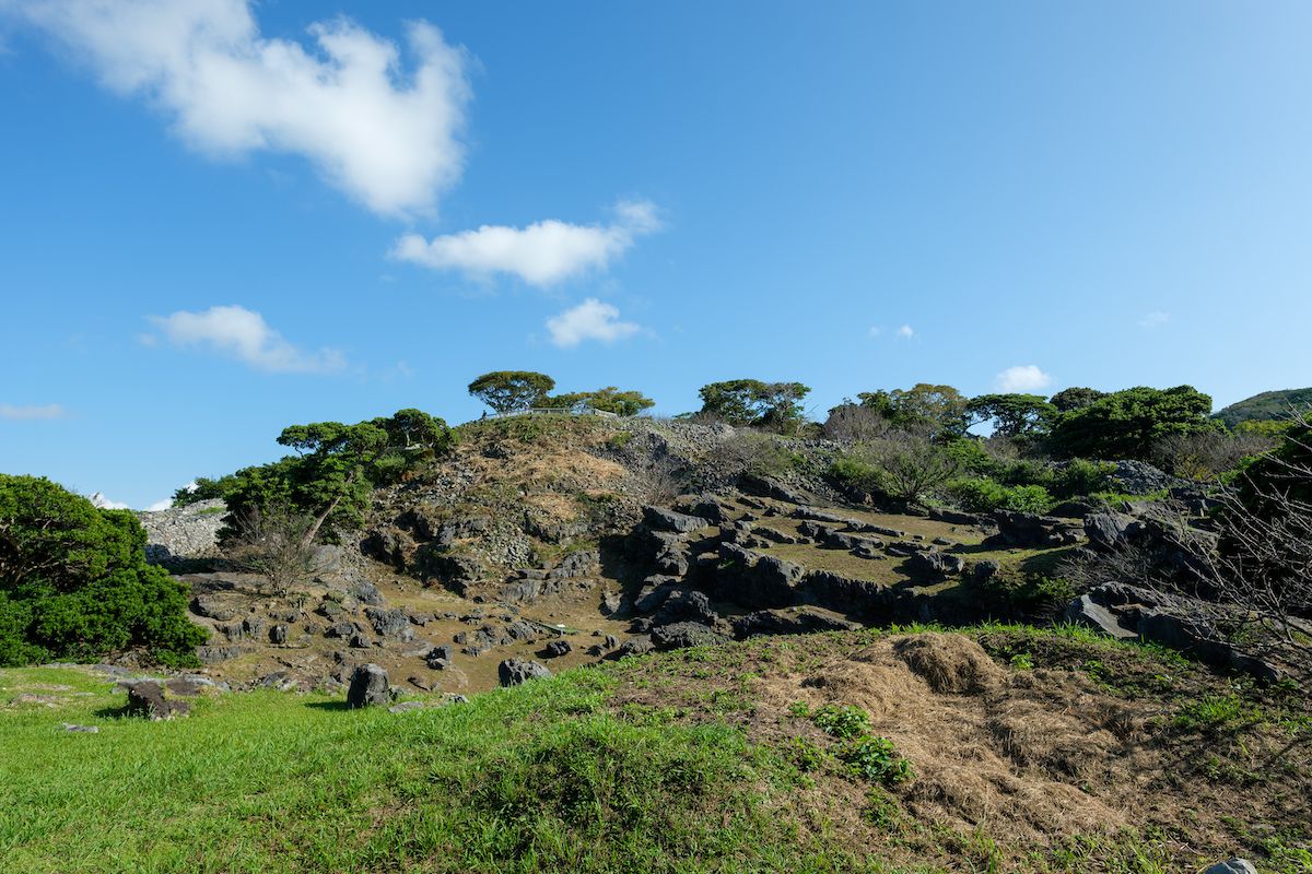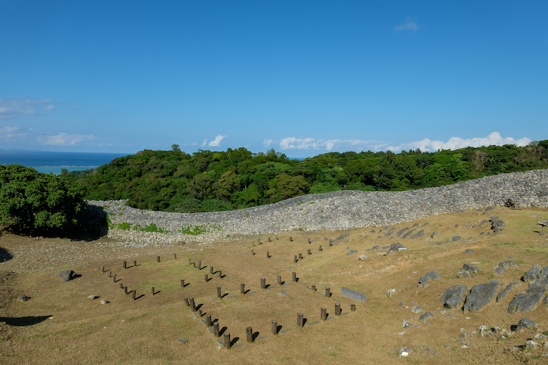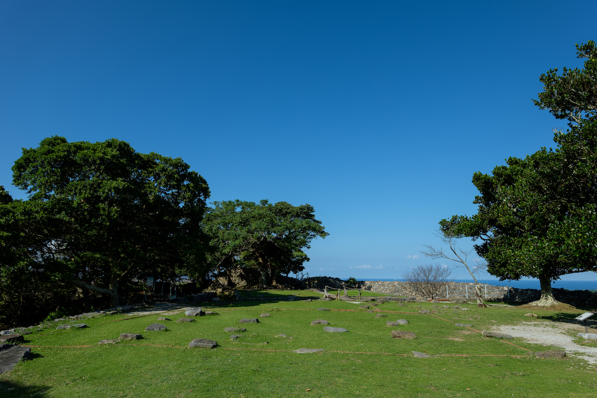 今帰仁グスクに仕えた女官達の生活の場と考えられ、城内で最も神聖な場所です。眺めがよく眼下には大隅やうねるように続く城壁が見え、その向こうには東シナ海が広がっています。