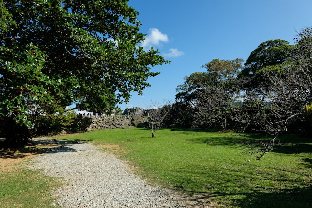 今帰仁グスクの最も外側の郭です。高さ2mほどの石垣が続き郭内には屋敷跡が発掘されています。