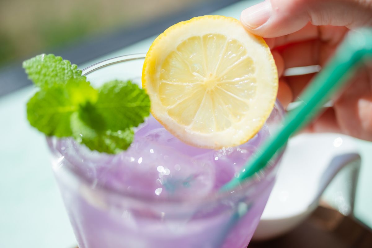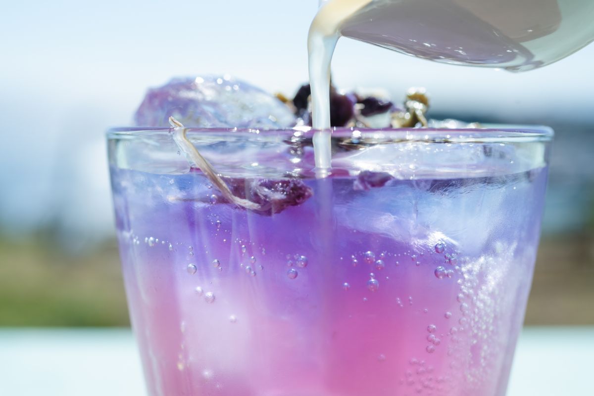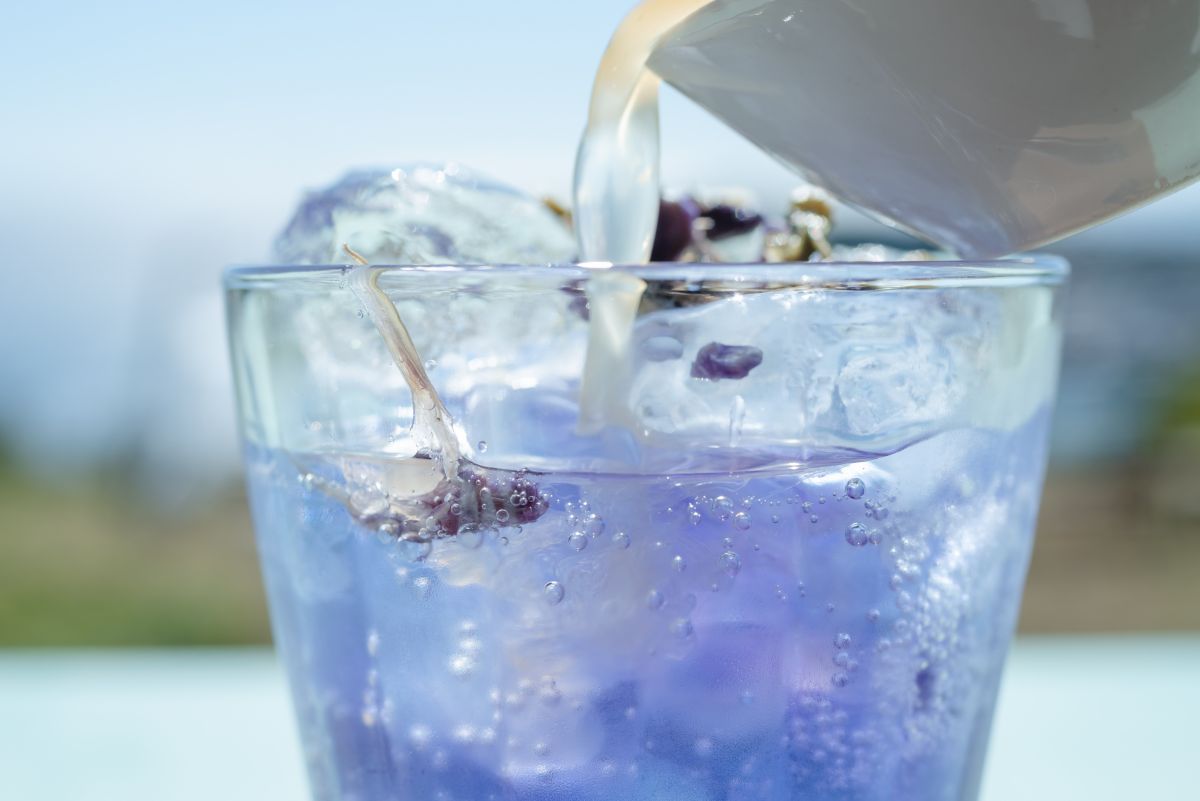 シロップを入れると、みるみるうちに青から紫、そしてピンクへと美しいグラデーションを描いていきます。寒色から暖色へと変化する様子を眺めているだけで、気持ちまで明るくなるよう。